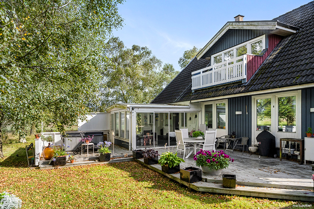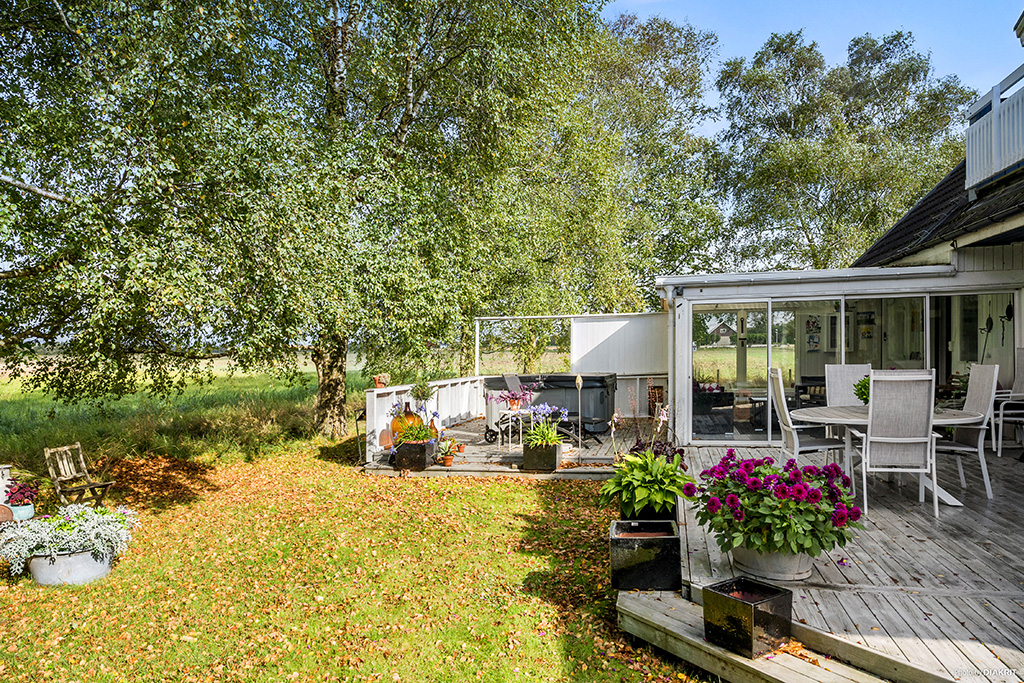 Från vardagsrummet kommer vi vidare ut i det vackra och omtyckta uterummet. Här njuter man av de sena kvällarna med utsikt över de angränsande fälten.